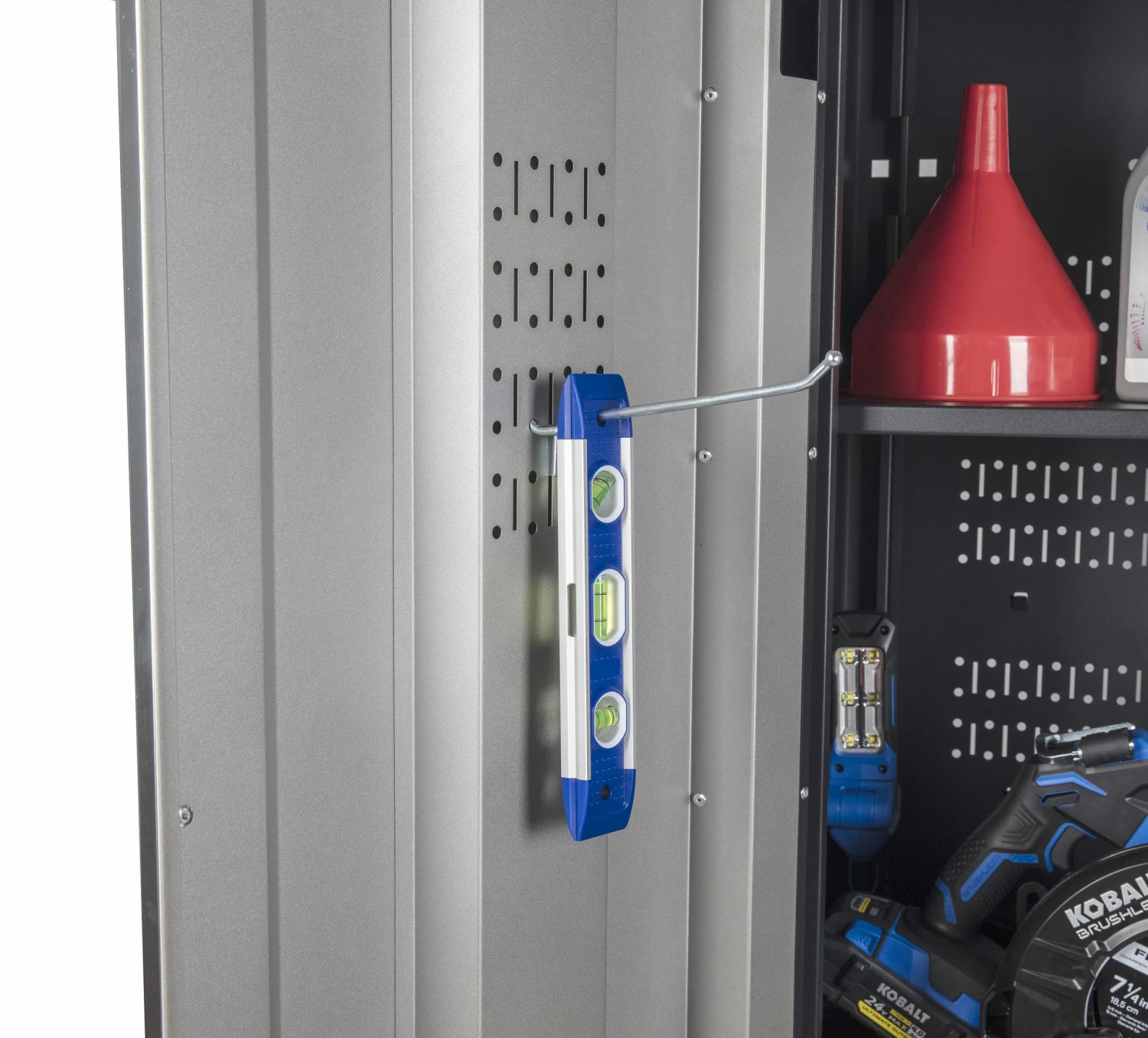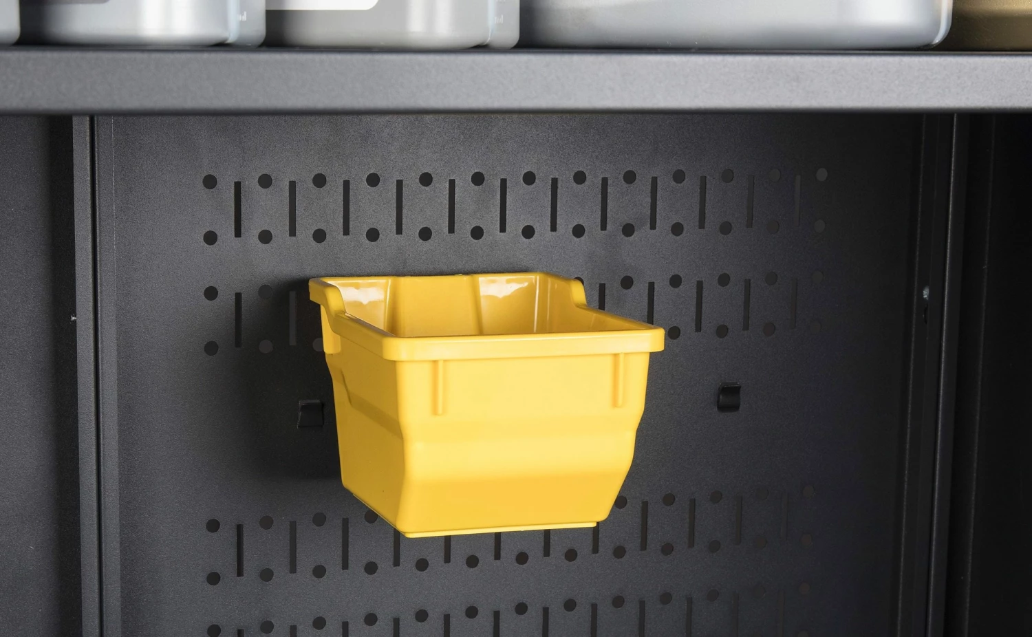 - Perforated doors and back panel for hanging peg hooks and bins