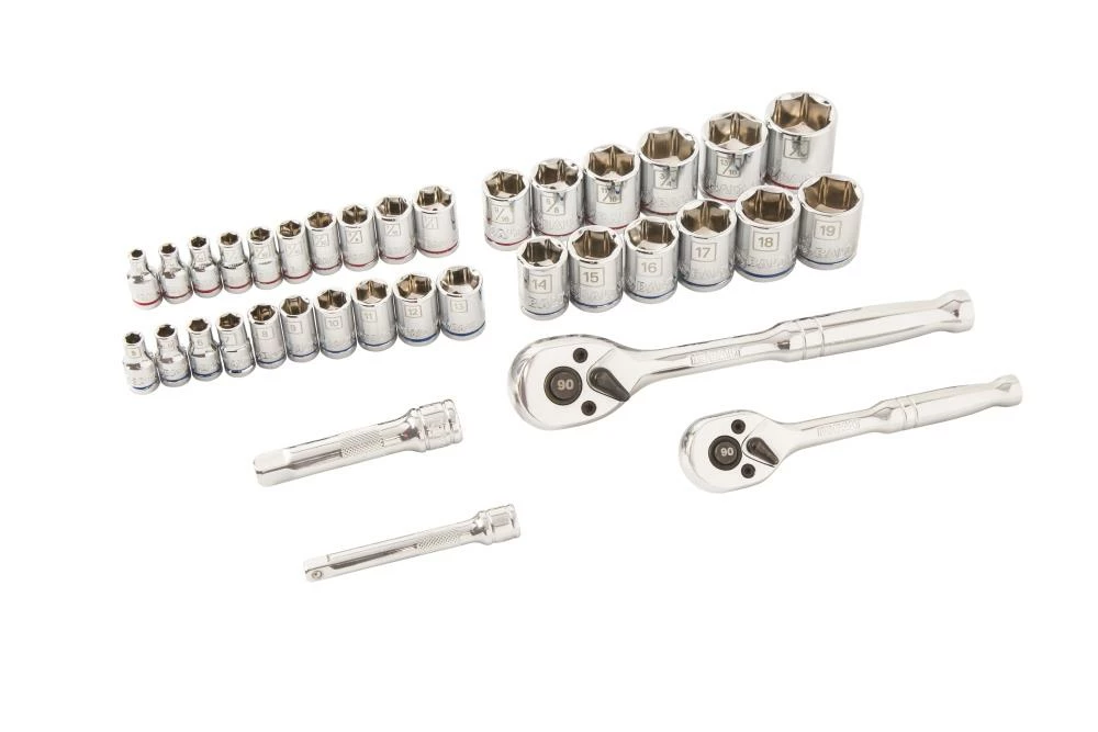 A bit more robust than our 73-piece general purpose tool set, this 119-piece household tool kit consists of 1/4-in and 3/8-in drive sockets and drive tools and accessories, giving you an advantage while making more advanced repairs at home or work.
