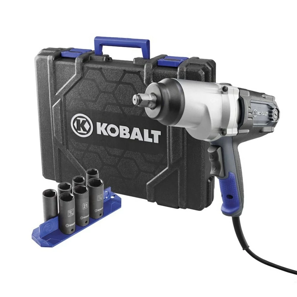 This powerful Kobalt corded 8 Amp impact wrench will take care of most projects. The wrench comes with a cast-aluminum gearbox and a high-density plastic housing for extended durability. The rubber grip provides the user with the utmost control and comfort.
