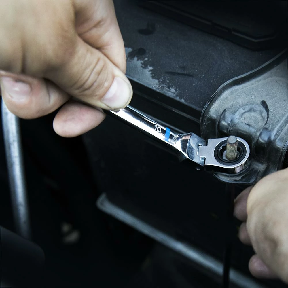 - Set includes 10, 11, 12, 13, 14, 15, 17 and 18 mm flex-box ratcheting wrenches